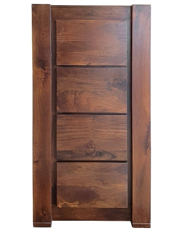 - Wysoka komoda z litego drewna mango w kolorze ciepłego brązu. Cztery przestronne szuflady, satynowe wykończenie i ręczne wykonanie. Idealna drewniana komoda do sypialni, salonu lub gabinetu.