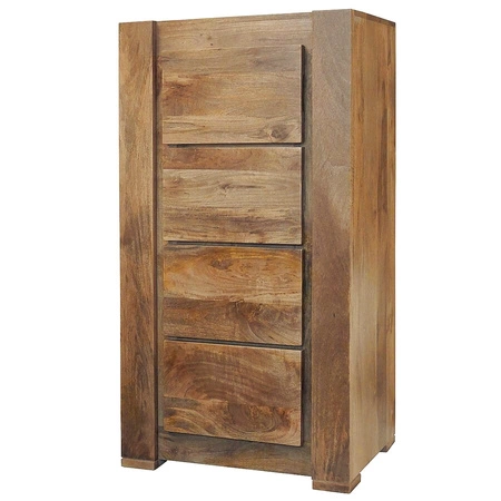 - Wysoka komoda z litego drewna mango w kolorze jasny brąz toffi. Cztery przestronne szuflady, minimalistyczny design i ręczne wykonanie. Funkcjonalna komoda drewniana do salonu, sypialni i gabinetu.