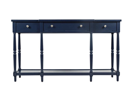 - Elegancka konsola w stylu Hampton w kolorze ciemnogranatowym. Toczone nogi, trzy szuflady, dolna półka i srebrne uchwyty tworzą stylowy mebel idealny do przedpokoju, salonu lub sypialni.