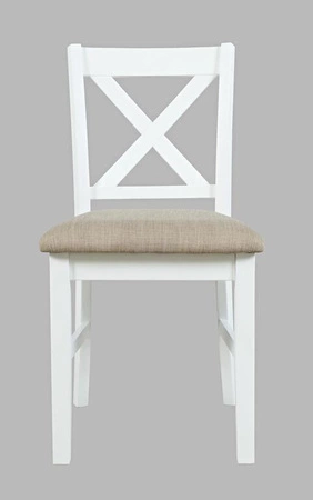 Krzesło tapicerowane w stylu rustykalnym – biała klasyka z krzyżowym oparciem i miękkim siedziskiem