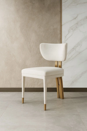 To krzesło tapicerowane w stylu glamour to połączenie komfortu, elegancji i nowoczesnego designu. Miękka tkanina szenilowa w odcieniu bieli pięknie współgra ze złotymi nogami ze szczotkowanej stali nierdzewnej, tworząc wyjątkowy efekt luksusu.