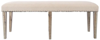 Ławka tapicerowana rustykalna – jasne drewno, beżowa tkanina, shabby chic