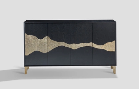 Komoda czarna ze złotymi akcentami to połączenie stylu i funkcjonalności, które doda wnętrzu eleganckiego charakteru. Korpus z okleiny dębowej oraz złote detale, takie jak parametryczny wzór na drzwiach i nogi, przyciągają wzrok, nadając meblowi luksusowy wygląd.