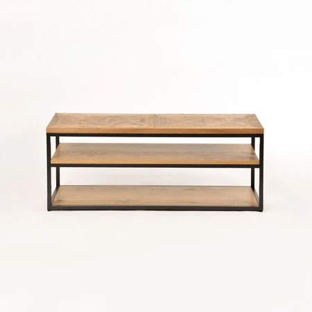 Wzbogać swoje wnętrze o szafkę RTV w stylu industrialnym, która doskonale łączy estetykę z praktycznością. Wykonana z litego drewna białego dębu, ta szafka wyróżnia się blatem ozdobionym intarsją w kształcie litery X, co nadaje jej unikalnego charakteru. Stalowa konstrukcja w kolorze ciemnego grafitu zapewnia stabilność i trwałość, podkreślając jednocześnie surowy, loftowy styl. Dzięki dwóm otwartym półkom, mebel ten oferuje dużo miejsca na przechowywanie sprzętu RTV, książek czy dekoracji, dodając Twojemu salonowi wyjątkowego uroku.