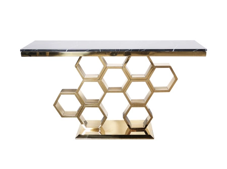 • Konsola glamour z czarnym blatem imitującym marmur oraz złotą podstawą. Blat ma długość 150 cm. Podstawa w kształcie plastrów miodu.