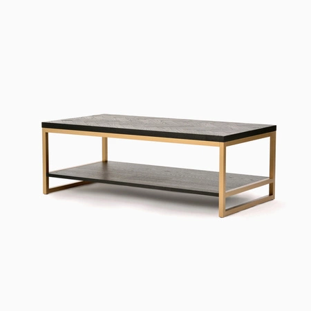 • Elegancki stolik kawowy z półką. Ława wykonana z drewna bukowego i dębowego, z czarnym blatem z intarsją w jodełkę oraz złotymi nogami. Idealny wybór do salonu w stylu glamour lub retro.