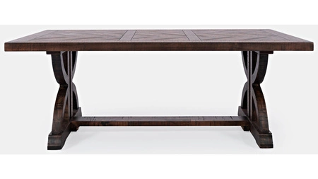 Stylowa, drewniana ława kawowa w stylu rustykalnym i prowansalskim na stylizowanych nogach w kształcie krzyża o zaokrąglonych krawędziach a całość wybarwiona w kolorze ciemnego dębu. Masywny blat ławy charakteryzuje się intarsją w jodełkę. Prostokątny drewniany stolik posiada widoczną strukturę drewna z efektem postarzania w postaci wgłębień i drobnych rys, nadających całości surowego akcentu. Ponadczasowy design i rustykalna forma sprawi, iż każde wnętrze nabierze swojskiego uroku. Ława doskonale wpasuje się w pomieszczenia z klasycznym kominkiem czy też w aranżacje eklektyczne.